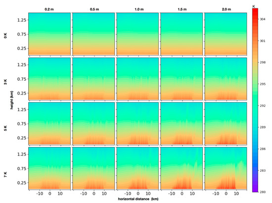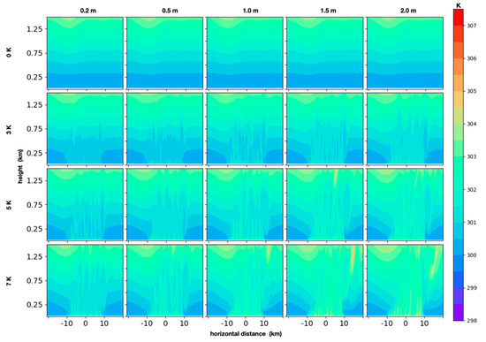 All simulations produce a squall line that develops from the initial thermal perturbation and travels left-to-right across the domain. By t = 120 min, the squall line has not yet passed over the idealized city in any of the simulations, but differences in the low-level thermodynamic structure over the idealized cities are readily apparent (Figure 1). In the control simulation (0Kz0.2), temperature is horizontally homogeneous in the environment ahead of the squall line. The same is true in all ΔT = 0 K simulations. However, as ΔT increases, a dome-like structure in the near-surface temperature develops (see 3Kz0.2, 5Kz0.2, 7Kz0.2 simulations in Figure 1). As expected, the magnitude of the temperature excess in this thermal dome increases as ΔT is increased. Additionally, in simulations with ΔT > 0 K, increasing z0 results in a stronger and deeper thermal dome. For example, in the 7Kz0.2 simulation, the thermal dome structure does not extend above z = 0.5 km and temperature values within the dome are approximately 1 K warmer than areas outside the dome. In the 7Kz2.0 simulation, the thermal perturbation at the center of the domain extends up to 0.75 km and temperature values are 3–4 K larger than outside the dome. The depth of this dome is confined below z = 1 km in all simulations, in agreement with observations of real urban heat islands [36]. A further investigation (not shown) revealed that the simulations with enhanced z0 produced larger eddy mixing coefficients, which more efficiently mixed the warmer temperatures from the heated surface.