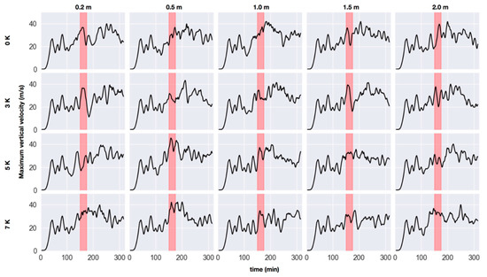 Figure 3 shows the time-series of domain maximum vertical velocity over the duration of each simulation. During the first 80 min, all simulations produce an identical evolution with smaller differences emerging after this time. Each simulation exhibits a sharp ramp-up period over the first 50 min of simulation followed by a quasi-steady period that lasts until approximately t = 120 min. From t = 120 min through t = 180 min, most simulations exhibit a steady increase in maximum vertical velocity to a new quasi-steady state of roughly 35–40 m s−1. After t = 200 min, most of the simulations show a gradual weakening in the maximum updraft. Despite the overall similarities, differences in evolution are evident. For example, the 0Kz0.2 simulation exhibits updraft weakening between t = 180 min and t = 210 min followed by a restrengthening. In simulations with ΔT = 0 K and enhanced z0, the weakening is not present and the maximum vertical velocity is enhanced. For a given value of z0, an increase in ΔT does not appear to have a notable impact on the domain maximum vertical velocity in most simulations. The exception to this trend is the z0 = 0.5 m experiments. The 5Kz0.5 and 7Kz0.5 cases have an abrupt spike in maximum vertical velocity centered on the time of interaction with the idealized city that is not present in the 0Kz0.5 simulation. The 3Kz0.5 simulation does exhibit a spike in vertical velocity, however it occurs approximately 20–30 min after interaction with the city.