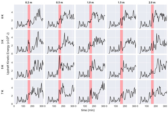 More distinct changes in the updraft structure are evident when evaluating the total kinetic energy of upward motion within the domain. A term herein referred to as updraft kinetic energy (UKE) is defined as: