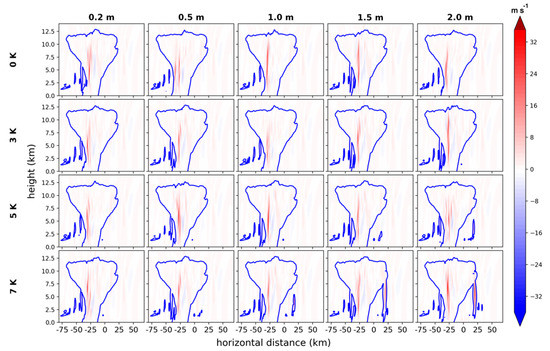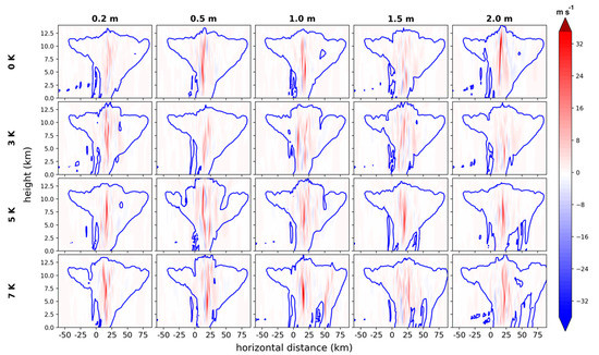 Vertical velocity (colored) at t = 130 min in each simulation. The blue contour represents a hydrometeor mixing ratio of 0.02 g kg−1.