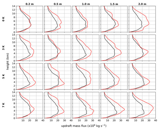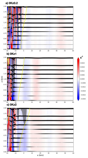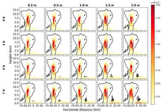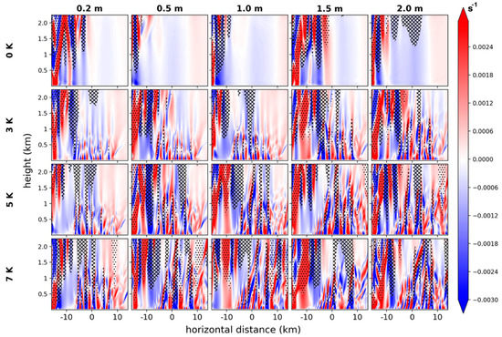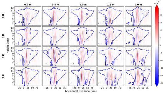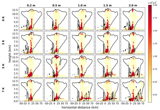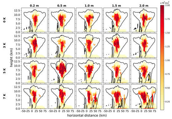 The vertical perturbation pressure gradient force (vppgf) calculated along each parcel trajectory is shown in Figure 14. The parcels shown in Figure 14 are located in the updraft at t = 165 min and traced backwards for 50 min. All simulations contain a ‘patch’ of large values of vppgf at low levels. In most of the simulations, a narrow band of larger vppgf extends upwards in the main updraft. One of the larger differences between the simulations is seen near the cloud top, which is above 10 km. It can be seen that for a given ΔT, increasing the horizontal z0 gradient typically results in a stronger vppgf near the cloud top. The increased vppgf near the cloud top indicates that these simulations contain wider updrafts, as shown in previous studies [39,40,41].