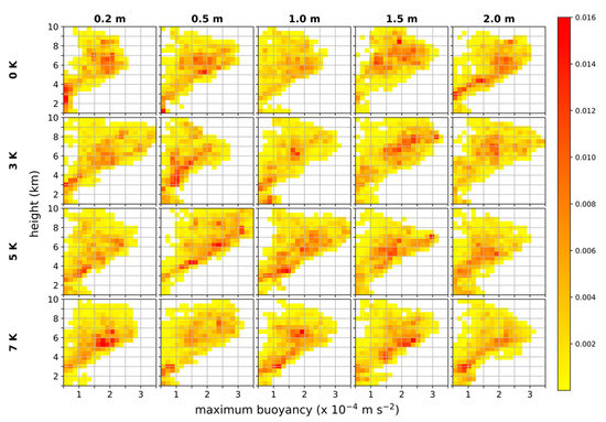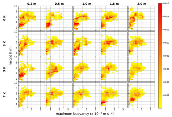 Further insights into the temporal evolution of updraft accelerations can be gained by analyzing contoured frequency by altitude diagrams (CFADs; Yuter and Houze [38]) of B. Figure 12 shows CFADs of maximum B along parcel trajectories for all simulations at t = 120 min. At this time, CFADs of B are very similar. In all simulations, most parcels achieve maximum buoyancy below 8 km and all parcels achieve a maximum B less than 2.5 × 10−4 m s−2.