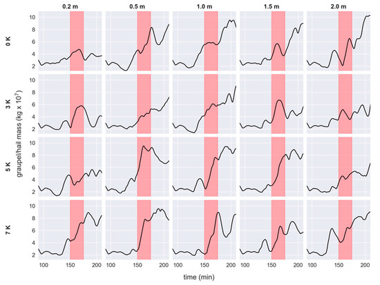 Stronger, more vigorous updrafts may increase the likelihood of surface or near-surface convective hazards such as flash flooding, hail, or damaging winds. Figure 16 shows time series plots of domain total graupel/hail mass (mgraup) in each simulation. In the control simulation, there is a steady upward trend from t = 100 min through approximately t = 170 min, with a maximum value of 4.7 × 107 kg. After the maximum is achieved, there is a slight reduction in mgraup before the values become steady. Within the tested parameter space, the control contains the smallest maximum mgraup value during the 100 to 200 min time window. When the horizontal z0 gradient is increased but ΔT remains zero, a substantial increase in mgraup (relative to the control simulation) occurs. In the 0Kz0.5 simulation, mgraup surpasses the maximum in the control simulation before the squall line passes over the city. By t = 170 min, after the storm has passed over the city, mgraup exceeds 8 × 107 kg. In the 0Kz2.0 simulation, maximum mgraup exceeds 10 × 107 kg at t = 200 min. Increasing ΔT while z0 = 0.2 m results in similar increases to mgraup. In the 3Kz0.2 simulation, the time evolution of mgraup is similar to the control simulation except that the peak is greater—5.8 × 107 kg compared to 4.7 × 107 kg. In addition, during interaction with the idealized city the rate of increase (inferred from the slope of the time-series line) is substantially greater in the 3Kz0.2 simulation compared to the control. In the 7Kz0.2 simulation, the rate of increase is similar to the 3Kz0.2 simulation but the period of increase is longer and the peak in mgraup is also substantially larger. When both ΔT and the horizontal z0 gradient are increased, many of the simulations exhibit a drastic increase in mgraup during (or slightly after) interaction with the city (see 3Kz1.5, 5Kz0.5, 5Kz1.0, 5Kz1.5, 7Kz0.5, 7Kz1.0, 7Kz1.5). An additional difference can be seen prior to interaction with the idealized city. In the control simulation, mgraup remains between 2 × 107 kg and 3 × 107 kg from t = 100 min through t = 130 min before steadily increasing. Many of the simulations with enhanced ΔT and/or z0 exhibit a decrease in mgraup around this time, with several of the simulations exhibiting rather sharp decreases just prior to interacting with the idealized city (0Kz0.5, 3Kz0.2, 3Kz1.0, 5Kz0.2).