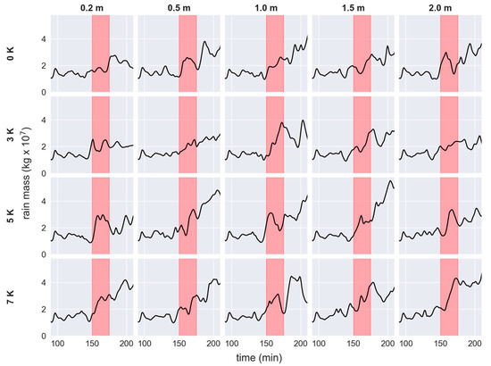 A similar evolution is apparent in the domain total rain mass (mrain). Figure 17 shows that in the control simulation, the mrain is relatively constant from t = 100 min through t = 200 min, except for a slight increase in mrain after t = 180 min which quickly subsides. In contrast, when ΔT remains zero, simulations with an enhanced z0 gradient produce more substantial increases in mrain following interaction with the city. Increasing ΔT also tends to result in larger mrain. All of the ΔT = 7 K simulations have a maximum mrain of greater than 4.0 × 107 kg during the time window shown in Figure 17, whereas for the ΔT = 0 K and ΔT = 3 K simulations, only 0Kz1.0 and 3Kz1.0 contain mrain exceeding 4.0 × 107 kg. In addition, many of the simulations (0Kz2.0, 3Kz1.0, 3Kz1.5, 5Kz0.2, 5Kz0.5, 5Kz1.0, 5K2.0, 7Kz0.2, 7Kz1.0, 7K1.5, 7K2.0) exhibit a pronounced increase in mrain when the squall line is passing over the idealized city.