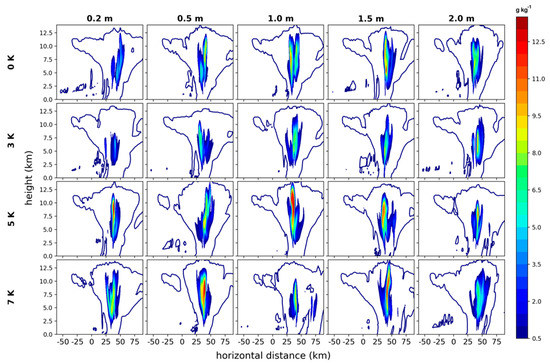 Vertical cross-sections of the graupel/hail mixing ratio at t = 190 min. The blue contour represents the hydrometeor mixing ratio of 0.02 g kg−1.