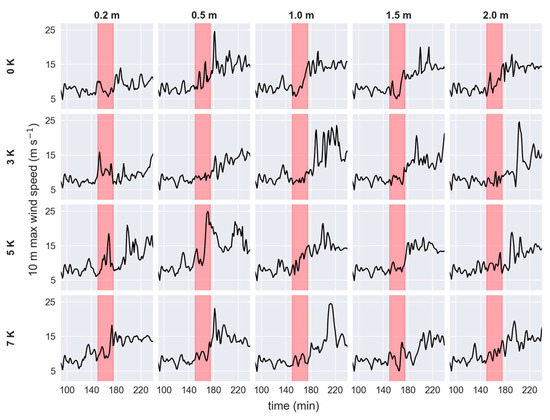 Interaction with the idealized city also has an impact on the near-surface winds. Figure 19 shows the time-series of the maximum 10-m wind speed in each simulation. In the control simulation, the maximum fluctuates around 10 m s−1 between t = 100 min and t = 170 min. After 170 min, there is a sharp, brief increase to a peak value of 14 m s−1 followed by a slight decrease. This value (14 m s−1) represents the smallest peak 10-m wind speed in any of the simulations. In the 0Kz0.5 simulation, the peak maximum is larger compared to the control simulation (24.5 m s−1 vs. 14 m s−1) and occurs approximately 10 min earlier. While this peak value is short-lived, values of roughly 15 m s−1 persist until the end of the simulation (not shown). The remaining ΔT = 0 K simulations also exhibit steady maximum winds of roughly 15 m s−1 after interaction with the city, although none have the drastic peak seen in the 0Kz0.5 simulation. Increasing ΔT also results in increased maximum values. For example, in the 3Kz0.2 simulation, the maximum wind speed of 16 m s−1 occurs 36 min prior to the maximum in the control simulation, when the squall line begins interacting with the idealized city. Further increasing ΔT to 5 K results in even stronger 10-m winds. A value of 16 m s−1 occurs during the interaction with the idealized city, and another peak of 21 m s−1 occurs around t = 200 min. In the 7Kz0.2 simulation, the maximum 10-m wind is larger than in the control and 3Kz0.2, but weaker than in 5Kz0.2. Many of the simulations with enhanced ΔT and horizontal z0 gradients produce sharp peaks in the maximum 10-m wind during or shortly after interaction with the idealized city. The strongest winds are found in the 3Kz1.0 (23.6 m s−1 at 222 min), 3Kz2.0 (25 m s−1 at 203 min), 5Kz0.5 (25 m s−1 at 171 min), 5Kz1.0 (21 m s−1 at 200 min), 7Kz0.5 (23 m s−1 at 182 min), and 7Kz1.0 (24.5 m s−1 at 212 min).