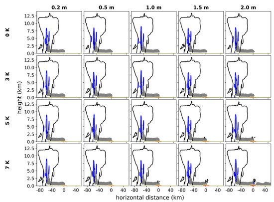 Figure 18 shows cross-sections of the graupel/hail mixing ratio (qg) after interaction with the idealized city. In the control simulation, the largest qg values are found between 3 and 5 km above the surface, with a maximum value of 6.6 g kg−1. Increasing z0 over the city while ΔT = 0 K results in larger values of qg as well as an increase in the area of qg > 1 g kg−1. Increased qg is also found when ΔT is increased while z0 remains 0.2 m. The largest values of qg are found in the simulations where both ΔT and the horizontal z0 gradient are increased. In particular, a maximum qg in both the 5Kz1.0 and 7Kz0.5 simulations exceed 13 g kg−1. Within the tested parameter space, only the 3Kz0.2 simulation yields a smaller maximum qg value at t = 190 min compared to the control simulation.