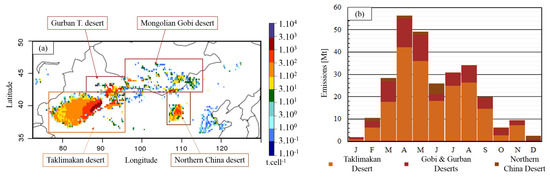 (a) Mean annual dust emissions from the main arid areas in Asia, simulated with CHIMERE for 2011, 2013 and 2015, in t cell. (b) Monthly emissions for the main arid areas in Mt.