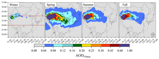 CHIMERE seasonal 550 nm Aerosol Optical Depth (AOD) associated to dust aerosols for Winter, Spring, Summer and Fall. Beijing (B), Chengdu (C) and Shanghai (S) locations are indicated on Winter map. Red lines on Winter map indicate 39.5 and 31.0 latitudes.