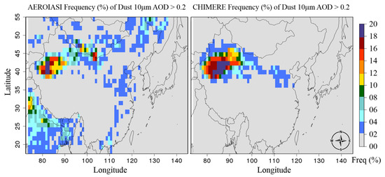 Additional information is gained from AEROIASI retrieval, deriving AOD at 10 m. CHIMERE AOD for dust at 10 m was calculated to compare with an additional independent instrument particularly sensitive to the coarse fraction of aerosols. In this analysis only focusing on dust, we have evaluated the model ability to simulate the occurrence of dust events (with AODs larger than 0.2). Frequencies (in %) of daily dust 10 m exceeding 0.2 in AEROIASI and CHIMERE are displayed on Figure 3, covering 2011, 2013 and 2015 period (used here for model evaluation, but not as a climatology). The AOD threshold is most likely to be exceeded in desert areas and both retrieval and model highlighted the same patterns. Similarly, as in the MODIS comparison, the Mongolian Gobi desert frequencies are underestimated and Taklimakan frequencies are slightly overestimated but well reproduced.