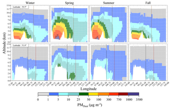 CHIMERE dust concentration vertical profiles longitude cut for winter (1st column), spring (2nd column), summer (3rd column) and fall (4th column). 1st row shows profiles for 39.5 latitude, 2nd row shows profiles for 31.0 latitude. Altitudes are calculated compared to sea level. All figures are produced with 2011, 2013 and 2015 data. Beijing is identified on 1st row by the brown vertical line, Chengdu is identified on 2nd row by the black vertical line and Shanghai is identified on 2nd row by the red vertical line. Transect latitudes are displayed on Figure 2.