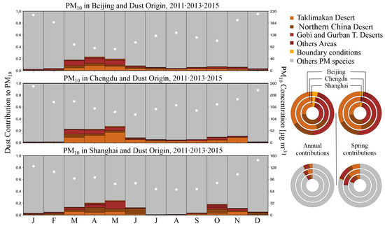 Dust contribution to PM pollution in Beijing, Chengdu and Shanghai—Monthly variation calculated from 2011, 2013 and 2015 simulations. Ring plots show annual and spring contributors to PM (bottom) and dust origin area (top) for the three cities. White dots variations in monthly PM concentrations for the three cities.