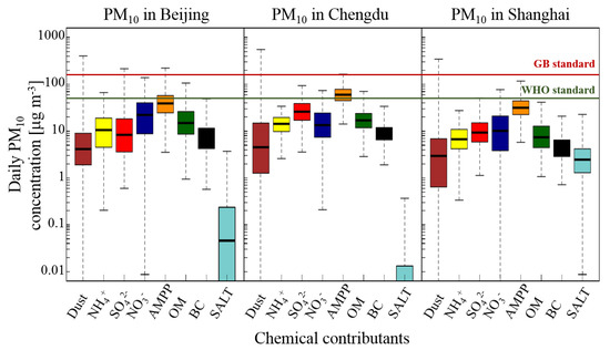 It can be observed for the three cities that the highest daily PM levels are reached during winter, and the lowest ones during spring (for Beijing) or summer (Shanghai and Chengdu). Amplitudes for these daily values are smaller for Shanghai, ranging from 60 g m to 160 g m than for Beijing and Chengdu, ranging between 90 g m to 250 g m. These values are particularly high compared to Chinese National Standard GB 3095-2012 for PM in an urban environment, i.e., 24 h mean: 150 g m and annual mean: 70 g m.
