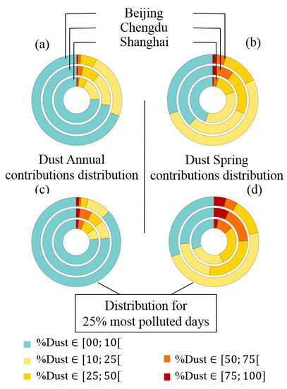 From Figure 7 and also Table 6 it can be observed for the whole period, that mineral dust is a minor contributor to PM and even more to PM concentrations. For instance, for most of the days (between 70% to 75%) for the three cities, the dust contribution to PM is below 10% (Figure 7), only for 7.2% to 11.0% of days, dust it is more than 25 %. When studying the 25% most strongly polluted days, dust have slightly larger contributions for Chengdu and Shanghai, but not for Beijing. For the first two cities, this means that the dust presence is correlated with pollution events, although it is generally not dominant. On the contrary, for Beijing, PM pollution events occur during winter due to anthropogenic sources, and dust has only little impact on air pollution for this season.
