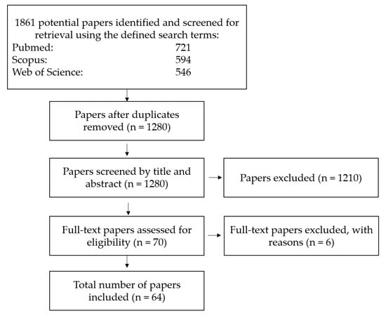 The systematic review has been performed following the Preferred Reporting Items for Systematic reviews and Meta-Analyses (PRISMA) guidelines [], and the relevant research studies have been retrieved, as reported in Figure 1. The goal of the review was to thoroughly understand the plausibility, mechanisms, and evidence of the aerosol transmission of SARS-CoV-2 from the peer-reviewed literature on human coronaviruses and their viral surrogates (animal coronaviruses and phages), as previously described for water environments []. The literature search was conducted on 5 June, 2020 using three electronic databases (PubMed, Scopus, and Web of Science core collection) without time limitations. The searches were performed using the following search terms in the query: (aerosol OR bioaerosol OR airborne OR air transmission) AND (coronavirus OR SARS OR MERS OR COVID-19). The database searches provided 1861 hits: 721 retrieved from Pubmed, 594 from Scopus and 546 from Web of Science. These articles were assembled, and duplicates were removed. Then, papers were screened in terms of three main inclusion criteria based on title and abstract: (1) studies focused on coronavirus in air/aerosol (so, not on fomites, surfaces or various types of waters); (2) peer-reviewed research articles or surveillance reports presenting primary data, (3) written in English. Documents deemed relevant were kept for a full reading. In total, 70 original articles were selected for full reading, then seven papers were removed after inclusion because they addressed the description of an index patient, but without secondary cases that hampered the epidemiological investigation. Overall, 64 studies were complied with the selection criteria and included in this review. The list of the references excluded, with reasons, are reported in Appendix 1 of the Supporting Information.