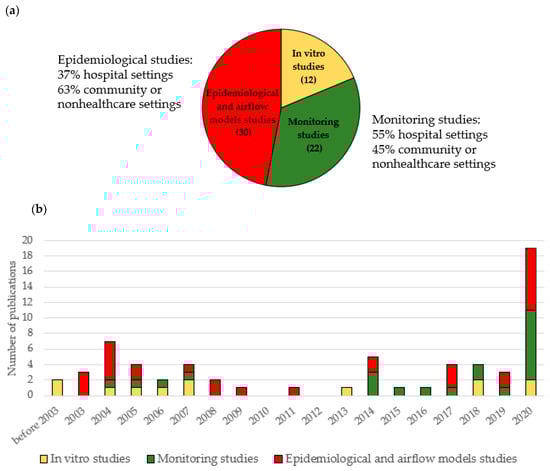 The collected papers have been classified according to their topic into three categories: in vitro (12 papers), monitoring (22 papers) and epidemiological and airflow models studies (30 papers) (Figure 2a, Table 1). Their time trend shows a small increase after 2003 (when the SARS epidemic occurred) and in 2014 due to the MERS appearance, followed by a higher raise in 2020 owing to COVID-19. The time trend of the studies according to the identified topic is depicted in Figure 2b.