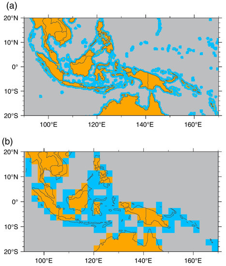 We partitioned the Maritime Continent into land, coast, and ocean areas as in Worku et al. [6]. For the TMPA data, pixels were categorized based on the distance between the pixel center and land using the Naval Oceanographic Office’s (NAVOEANO) 1-km Very High-Resolution land/sea tag map with distance from land. Pixels centered on land were classified as land, those within 50 km of land were considered coast, and those farther than 50 km were classified as ocean (Figure 1a).