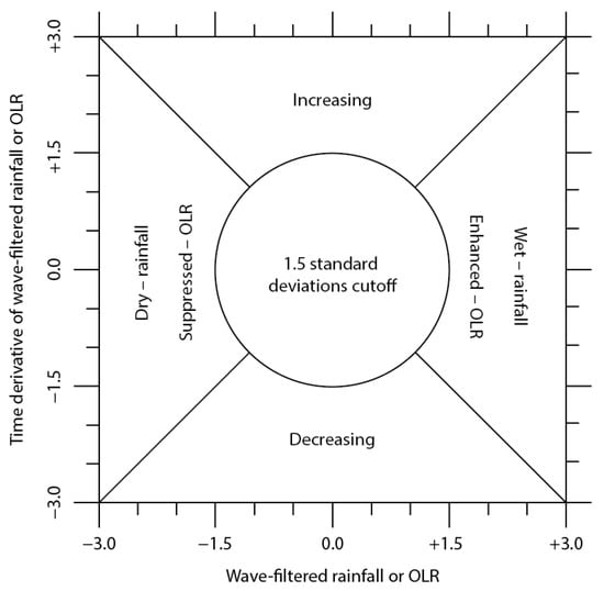For each wave type, we obtained a time series by averaging the filtered data from 10° S–10° N at 100° E (near Sumatra in the western Maritime Continent). A second time series was created using the time derivative of the first. Both time series were standardized and used to create a phase space analogous to that used in Janiga and Thorncroft [48]. The x-axis was the filtered data, and y-axis was the time tendency (Figure 2). Similar to the RMM, amplitude was calculated as the vector magnitude of the two-time series. Magnitudes less than 1.5-σ were discarded as they were associated with inactive wave states. The remaining dates were categorized based on the relative values of the two-time series into four categories: wet (or enhanced), decreasing, dry (or suppressed), and increasing. The TMPA rainfall estimates were binned using filtered TMPA data, while the IR-WS data were binned by filtered OLR to match its longer period of record.