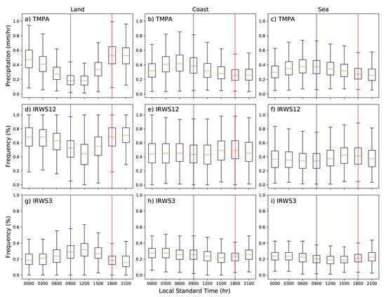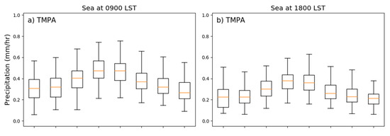 Rainfall over land is minimum between 09:00 and 12:00 LST and maximum between 18:00 and 21:00 LST (Figure 3a). The rainfall distributions during morning–midday and later afternoon–evening are markedly different (e.g., the 25th percentile at 18:00 LST is near the 90th percentile at 09:00 LST). This difference is consistent with the diurnal cycle of total rainfall in Mori et al. [5], although they showed only Sumatra Island for the full year.