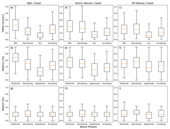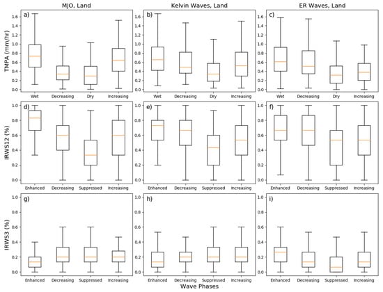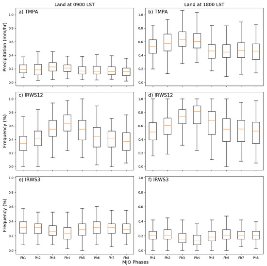 Figure 4, Figure 5 and Figure 6 present the DJF rainfall and IR-WS during the eight RMM phases at 09:00 LST and 18:00 LST, separately, for land, coast, and ocean areas. Over land, rainfall is heaviest is phase 3, closely followed by phase 4, and is smallest during phases 5–8. The morning median rainfall (Figure 4a) is small (median ~0.2 mm·h−1) during all phases. Despite the small range of values, the rainfall in the enhanced phases (3–4) is about 40% higher than during the suppressed phases (5–8). Even though the absolute difference is less than 0.05 mm·h−1, the median rainfall during the enhanced phases would be at the upper quartile of the suppressed phases. The afternoon rainfall (Figure 4d) has a similar fractional modulation with the median for the enhanced phases, being about 30% higher than the suppressed. However, the rainfall is more than twice as high in the afternoon than the morning, so the observed median rainfall is 0.2 mm·h−1 higher during the enhanced phase than the suppressed.