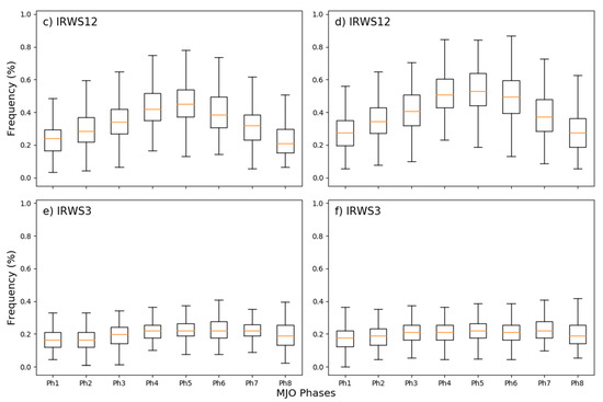 Figure 4b,e shows the distribution of IR-WS12 with respect to MJO phases over land at both times of day. The overall evolution is similar to but somewhat delayed from rainfall. IR-WS12 has a clear maximum in phase 4 and a minimum in phases 8–1. Unlike rainfall, the modulation of IR-WS12 by the MJO is similar in both the morning and the afternoon. The IR-WS data are measured as the frequency of occurrence, so they cannot exceed 100%. At 18:00 LST (Figure 4e), the 90th percentile is near 100% IR-WS12 for all phases except 7 and 8. During the peak of the MJO, even the 75th percentile is near 90% IR-WS12. These large percentages mean that the IR-WS12 is so prevalent at 18:00 that the enhanced MJO phases can only increase them so much.