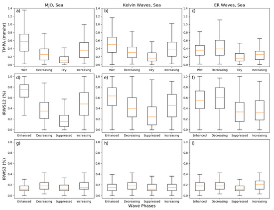 The modulations of afternoon convection over the coastal regions (Figure 8) are similar to those over land (Figure 7). The rainfall rates are lower over the coastal regions (Figure 8), but the relative modulation closely follows that over land. As with the RMM (Figure 5c,f), the MJO and equatorial waves have no consistent effect on IR-WS3 over the coasts (Figure 8g–i). The other notable difference is that for ER waves the rainfall over the coast is the same between the enhance/wet phase and the decreasing phase. Similarly, IR-WS12 is actually higher during the decreasing phase. The convective variability over the sea (Figure 9) is also similar to that over the coasts. Interestingly, the relative modulation of both rainfall and IR-WS12 is largest over the sea (Figure 9), while it is smallest over the coasts (Figure 8).