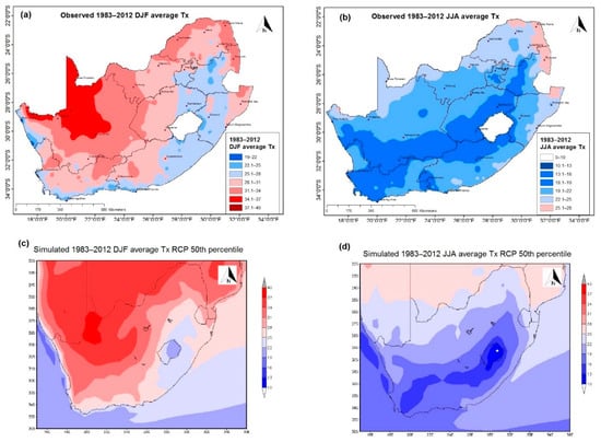 Observed 1983–2012 average Tx (°C) for (a) December–February (DJF) and (b) June–August (JJA) and simulations of 1983–2012 RCP 4.5 scenario 50% percentile average Tx (°C) for (c) DJF and (d) JJA.