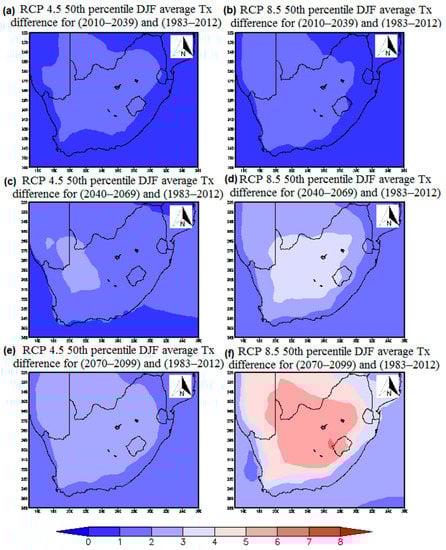 The climate change signal is expected to be largest for the period 2070 to 2099 (Figure 3e,f), because it is the furthest and the anthropogenic greenhouse gas concentrations will be largest especially in the RCP 8.5 emission scenario. The summer temperatures are projected to rise further, with increases going in excess of 6 °C in the RCP 8.5 scenario for the period 2070–2099. The projected increase across the coastal regions is also smaller as with the, near future and medium-term projections. All the ensemble members, both in the RCP 4.5 and RCP 8.5, show an increase in temperature across the whole of South Africa, which indicates that there is a high confidence in the temperature projections. The increase in the mean temperatures are expected to have an effect on the characteristic of HWs in the future climate.