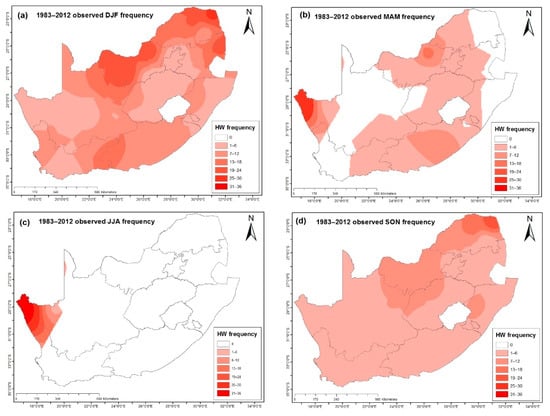 Observed HW frequency (total number of occurrence) across South Africa from 1983 to 2012 during (a) DJF, (b) March–May (MAM), (c) JJA and (d) September–November (SON).
