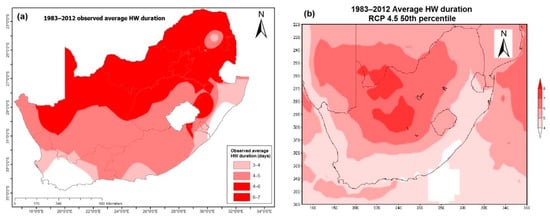 (a) Observed and (b) simulated HW average duration (days) across South Africa from 1983 to 2012.