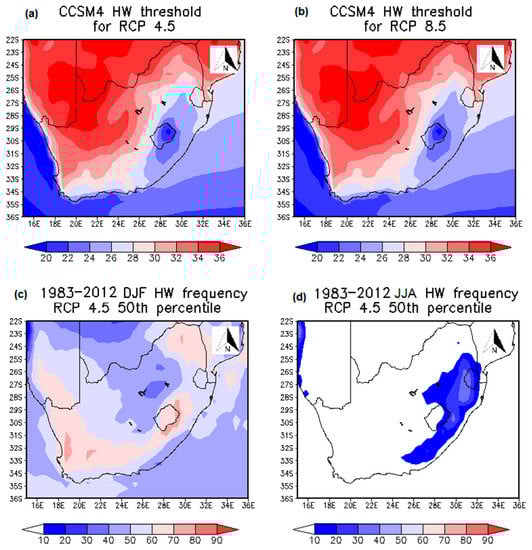 Simulations of HW thresholds (°C) for (a) CCSM4 RCP 4.5, (b) RCP 8.5 and RCP 4.5 scenario HW frequency (total number of occurrence) during the present-day climate, (c) 1983–2012 DJF and (d) JJA.