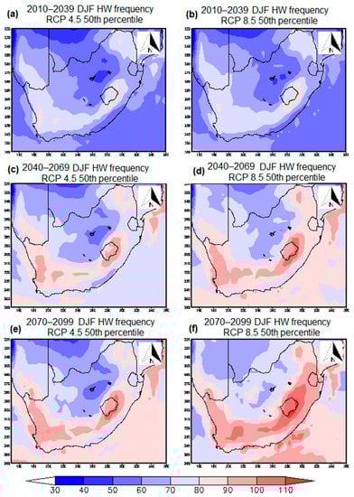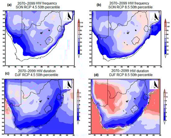 Dramatic increases in DJF HW frequency are expected during the 2040–2069 period (Figure 7c,d) when compared to the present climate, particularly along the south and eastern coastal regions (frequency of 30 HW higher over the 30-year period). These regions are expected to experience up to 100 events during summer over the 30-year period; which averages to slightly over three events per summer season per year. However, it has to be noted that these HWs are projected to last for less than a week along the coasts but the number of days per event increases inland. Increases in the number of HWs are also observed in a greater extent across the north-western parts of the country during both summer and autumn and the simulations also indicate that 2040–2069 HWs will have the longest duration, between 9 and 10 days, across this region in summer. This may be associated with increasingly dry conditions across this region, as the region experiences little or no rainfall throughout the year. Drier regions heat up quickly because the heating that reaches the surfaces does not start by evaporating water on the surface, which otherwise result in cooling by latent heat absorption [].
