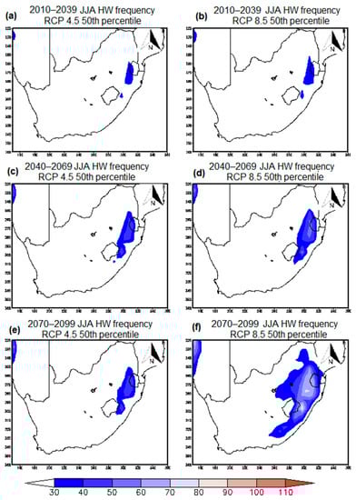 The number of HWs in the immediate future period of 2010 to 2039 is projected to be higher than the HW frequency in 1983–2012. As expected, the number of HW occurrences are higher during DJF (Figure 7a,b) season in 2010–2039, with areas in the east and northern parts of South Africa projected to experience over 80 events over the 30-year period which is about 10 more than the present-day climate frequency. The simulations for 2010–3039 indicate a slight increase in the overall number of HW frequency in South Africa, particularly across the eastern parts of the country during the JJA season (Figure 8a,b). Simulated HWs under the RCP 4.5 and RCP 8.5 scenarios are in agreement with both sets showing an increase in the events in the future climate. The spatial pattern of simulated HW frequency corresponds closely between the two scenarios for the immediate future period. The western parts of South Africa are simulated to experience the smallest number of HWs (less than 10 events in other areas) over this 30-year period during the austral autumn, winter, and spring. These are the parts influenced the most by passing cold fronts which are responsible for the winter rainfall.