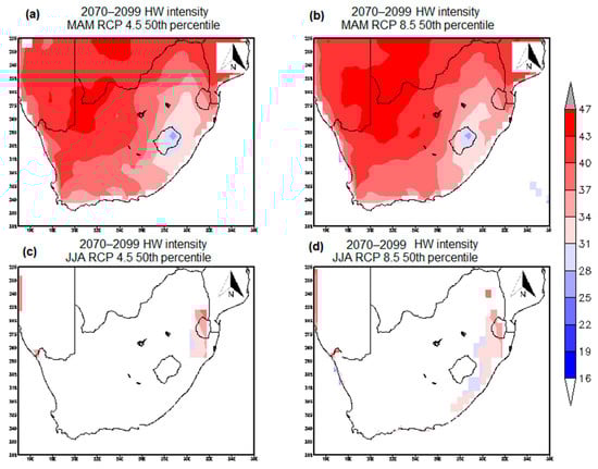 Simulations of HW intensity 50th percentile for (a) 2070–2099 MAM RCP 4.5, (b) 2070–2099 MAM RCP 8.5, (c) 2070–2099 JJA RCP 4.5, and (d) 2070–2099 JJA RCP 8.5.