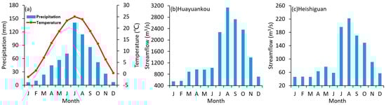 (a) Average monthly precipitation and temperature of the middle reaches of the Yellow River from 1950 to 2018, based on monthly climate datasets of the Climatic Research Unit (CRU) of the University of East Anglia (averaged over 33.5–36° N, 109–114° E). (b) The average monthly streamflow from 1919 to 1988 at the Huayuankou hydrological station. (c) The average monthly streamflow from 1951 to 1986 at the Heishiguan hydrological station.