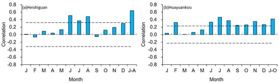 Correlation analyses between the regional chronology and streamflow at Heishiguan (a) and Huayuankou (b). The dashed lines represent the 95% confidence level.