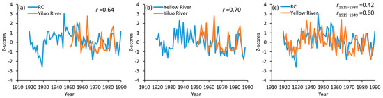 (a) Comparison between the regional chronology (RC) and observed June–August streamflow of the Yiluo River (Heishiguan). (b) Comparison between the July–October streamflow of the Yellow River (Huayuankou) and the July–October streamflow of the Yiluo River (Heishiguan). (c) Comparison between the regional chronology (RC) and the observed July–October streamflow of the Yellow River (Huayuankou).