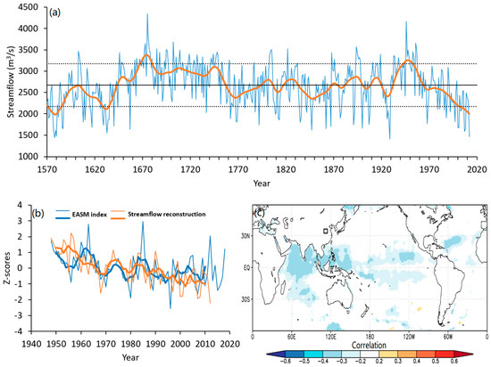 As shown in Figure 5c, some significant negative correlation areas with SSTs were found in the northern Indian Ocean and western tropical Pacific Ocean, implying that these tropical sea areas are the main water vapor sources for the middle Yellow River. Hydroclimatic conditions in Central China would be impacted by the Asian summer monsoon through water vapor transport from sea areas around China [29,35]. These water vapor source areas influenced by the Asian summer monsoon [36,37] also suggest possible teleconnections between our streamflow reconstruction and the Asian summer monsoon systems. Significant negative correlations between the moisture-sensitive tree-ring width record and SSTs in the northern Indian Ocean and western tropical Pacific Ocean are also found in the neighboring area [36], suggesting similar hydroclimatic variations for both areas. Although instrumental climatic data showed that the EASM has significantly weakened since the 1970s [29,38], our reconstruction shows that this dry trend may have started after the warm 1940s. During the past 30 years, this downward trend has been further exacerbated by increased evaporation as a result of climate warming [39], despite the EASM recovering from its weak epoch since the 1990s [40].