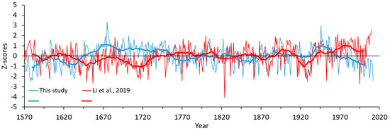 Commonly, with the northward movement of the monsoon rain belt, the middle Yellow River is substantially impacted by the EASM during June to October, and monsoon precipitation and streamflow increase rapidly, especially the July streamflow (Figure 2). The instrumental climate data show that the total precipitation and streamflow from June to October account for 73% of the annual precipitation and 66% of the annual streamflow in the middle Yellow River basin, respectively. The correlation between the observed precipitation and streamflow from 1953 to 1988 is r = 0.60 (p < 0.01). The EASM intensity is indicated by streamflow to a certain degree. Thus, it is obvious that the streamflow variation in this region is closely linked to the intensity of the East Asian summer monsoon and its associated monsoon precipitation [31]. In other words, higher streamflows mean a stronger summer monsoon, and vice versa. Based on the above points, the low and high streamflow periods correspond to weak and strong summer monsoon intervals, respectively. To establish the linkages between our streamflow reconstruction and the EASM, we analyzed the correlations between the EASM index and our streamflow reconstruction [29] for the 1948–2012 period. The stronger correlation (r = 0.23, p = 0.06) was between the concurrent June EASM index and our streamflow reconstruction and increased to 0.56 (p < 0.01) after 5-point smoothing (Figure 5b). Although we do not want to overinterpret these weak correlations, the positive correlations with the EASM index also suggest that the water cycles of the middle Yellow River are linked closely with the East Asian summer monsoon dynamics, which affect precipitation conditions over the Qinling Mountains [32,33,34]. This result is in line with our expectations.