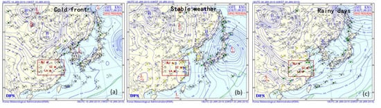 Surface weather patterns and locations of the sampling sites (the red square area represents the YRD, and the red stars represent the sampling sites).