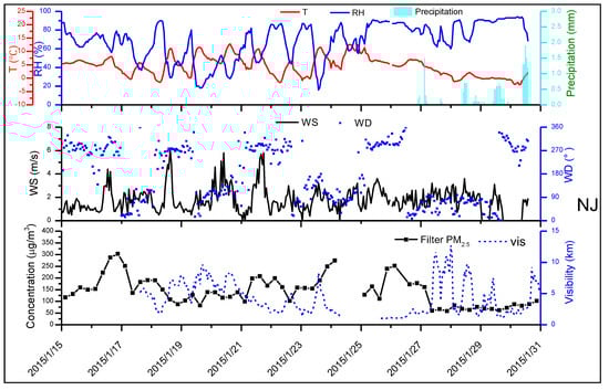 The temporal variations of the meteorological conditions and PM2.5 concentrations in NJ are illustrated in Figure 2, the same graphs for SZ and LA are shown in supplemental Figure S1. The meteorological conditions and PM2.5 pollution patterns at the three sites exhibit very similar temporal variations. From 15 to 26 January, the average PM2.5 concentrations were as high as 166.5 ± 43.2, 164.2 ± 44.5 and 147.5 ± 59.4 μg/m3, respectively, in NJ, SZ, and LA. The humidity averaged 63 ± 19, 72 ± 13, and 75 ± 20%, respectively, and the temperatures were 5.6 ± 3.3, 7.0 ± 3.0, and 7.1 ± 4.5 °C, respectively, in NJ, SZ, and LA. Such high PM2.5 concentrations resulted in low visibility, which was 4.0 ± 2.3, 2.9 ± 1.7, and 4.5 ± 3.8 km in NJ, SZ, and LA, respectively. During this pollution episode, eastern China was alternately dominated by cold front moving through and high-pressure system. According to the surface weather patterns, the cold front process occurred three times between 15 and 21 January, one of which is shown in Figure 1a. When the cold front progressed, the YRD was just on the south of the cold front passage. As a result, northwestern winds prevailed across the YRD, while the wind speed notably increased (up to 7.5 m/s) lasting for an average of 7 h when the wind speed was higher than 4.0 m/s, which is favorable for the long-range transport of aerosols. When the YRD was controlled by the high-pressure system from 22 to 26 January (Figure 1b), stagnant meteorological conditions occurred with low wind speeds (on average 1.8~2.2 m/s) promoting pollutant accumulation near the surface. Kang et al. (2019) [29] also found that the PM2.5 pollution episode over YRD during 21–26 January 2015 was attributed to a cold front passage (long-range transport) and the subsequent uniform pressure field (local accumulation), based on simulations of the Weather Research and Forecasting–Community Multiscale Air Quality Modeling System (WRF-CMAQ). Then this period between 15 and 26 January is called the pollution period.