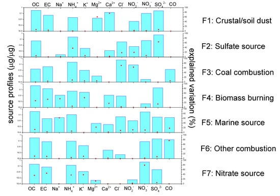 The high EVs of Ca2+ and Mg2+ in factor 1 indicate a crustal/soil dust source. Factor 2, which accounted for 59% of SO42− and 44% of NH4+, is dominated by a secondary sulfate source. Factor 3 is associated with almost 73% of the Cl− concentration. Cl− is a combustion marker, especially coal combustion, which is widely used in power plants [40]. Thus, factor 3 is regarded as coal combustion. Factor 4 is highly associated with K+, EC, and OC. K+ is a typical component of biomass burning. Therefore, factor 4 is regarded as biomass combustion. Factor 5 is loaded on Na+, which is usually deemed a sea salt source. Hence, factor 5 is considered a marine source. Factor 6 is characterized by a high contribution to CO and is interpreted as other combustion (such as vehicle engine combustion and trash burning). Factor 7 is primarily loaded on NO3− and NH4+, indicating a secondary nitrate source. The source apportionment of the PM2.5 sampled at all three sites shows that secondary nitrate and sulfate sources account for 38% and 23%, respectively, followed by biomass combustion (14%), marine (8%), other combustion (7%) and crustal/soil dust sources (5%). Hua et al. [41] suggested that the PM2.5 during a fall haze episode in the YRD mainly came from secondary pollutants and primary emissions of vehicles and biomass burning, which was similar as in this paper.