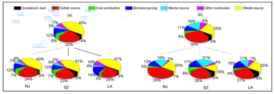 In terms of the water-soluble cation and anion concentrations, SO42+, NO3−, and NH4+ (SNA) were dominant. The SNA concentrations were 74.6 ± 37.7, 71.7 ± 35.0, and 61.8 ± 35.5 μg/m3 in NJ, SZ and LA, respectively, during the pollution period and 36.3 ± 23.2, 38.2 ± 29.2, and 25.1 ± 15.6 μg/m3, respectively, on the clean (rainy) days. The SNA/PM2.5 ratios in NJ and SZ were comparable (~0.45) and higher than that in LA (0.40, p = 0.008 < 0.05). Ions (such as SO42−, Cl−, K+) can be split into the seasalt and non-seasalt fraction. Assuming that the Na+ in particles comes only from sea-salt, the concentration of non-seasalt ions (nss-X) can be estimated by the equation: nss-X = [X]-[Na+]*ratio(X), with ratio(X) of 0.2455(SO42−), 1.727(Cl−), 0.0355(K+) [30]. The nss-SO42−, nss-K+ account for 90~99% of their soluble particulate ions, while nss-Cl− were 79~88%. The fractions of nss-ions were the highest at NJ, and the lowest at LA (Table S4).