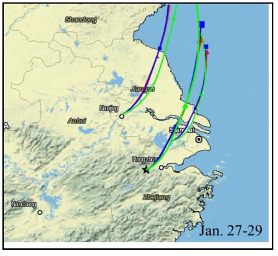 The 24-h backward trajectories for each site from 27–29 January (the red, blue and green lines represent the trajectories at 50, 100 and 500 m above ground level (AGL), respectively).