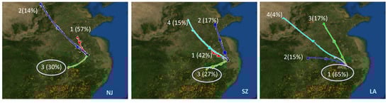 Figure 4 also shows that there are differences in the source contributions within the YRD. During the polluted period, the open burning source (biomass burning + other combustion) in LA (24%) contributed more compared with the other two sites (16%–17%) during the polluted period. The fire map illustrates that intensive open burning (such as biomass burning and trash combustion) was observed in the southwest of the YRD. The fire map and the cluster analysis results are combined in Figure 6. Cluster analysis of the 48-h backward trajectories shows that 65% of the air masses moving to LA came from the southwest direction, while only 27% and 30% of the air masses moved to SZ and NJ, respectively. It suggests that the larger contribution of open burning in LA occurred because more air masses were transported from the combustion zones in the southwest, thereby bringing more combustion products. On the clean days, the marine source was enhanced in SZ (21%) compared with NJ (16%) and LA (11%), probably because the SZ site was the nearest to the sea along the identified air mass trajectories (Figure 5).