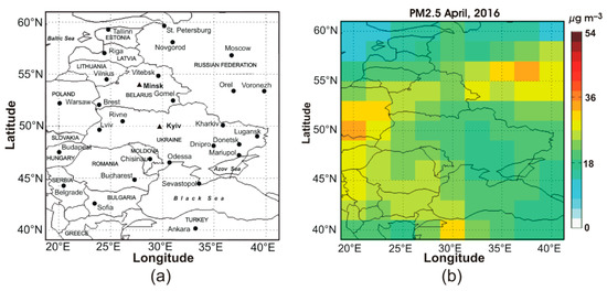 The layout of the Eastern European region considered for the study of aerosol spatiotemporal distribution is shown in Figure 1a. To avoid overloading the figures, the coordinates and city names will be omitted from further figures representing modeled aerosol distribution. The borders of the countries and seas in figures will assist to define the discussed areas.