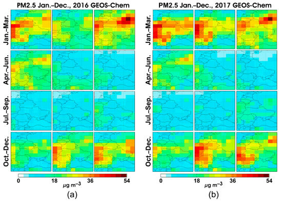 The spatial distribution of the monthly averaged PM2.5 concentrations in µg m−3 by the GEOS-Chem model calculation in (a) 2016 and (b) 2017.