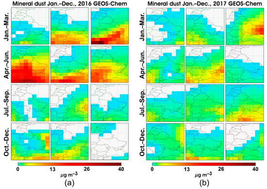 Mineral dust. Mineral dust aerosols represent soil particles suspended in the atmosphere. The comparison of the PM2.5 and mineral dust by distribution and content variations (see Figure 2 and Figure 3) reveals a significant difference. According to the modeled data, the mineral dust concentration increases over the southern part of the area, while the PM2.5 mostly impacts the western and northeastern areas. This result is confirmed by [52], where the main source of mineral dust is from the Saharan Desert via the Mediterranean Sea. The mineral dust content increased in springtime in the southwestern part of the area, whereas the PM2.5 mostly increased in the winter months. The significant difference in the mineral dust distribution and content from year to year is explained by the difference in atmospheric circulation and Saharan dust outbreak in spring 2016, when a large amount of mineral dust was transported from North Africa to Europe. The mineral dust enhancement in the eastern part of Ukraine was caused by wind erosion in the steppe region in March and May 2017, similar to the strong dust storm in 2007 [53].