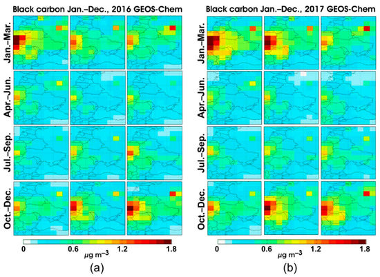 The black carbon monthly averaged concentrations in (a) 2016 and (b) 2017.