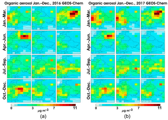 The spatial distributions of the monthly average concentrations of organic aerosols in (a) 2016 and (b) 2017.